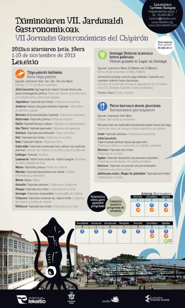 txipiroia osagai nagusia izango duten plater eta pintxo bereziak prestatuko dituzte. Aroa jatetxeak esate baterako txipiak plantxan eskainiko ditu, Aisa Lekeitiok txipiroi beteak plantxan tipula eta piperrekin, Batzokiak eta Jubilatuen etxeak txipiroiak bere tintan prestatuko dituzte, Egaña jatetxeak txipiroiak tipulagaz eta ànadera patatekin eskainiko ditu, eta Goitikon txipiroia arrozagaz eta perretxikoekin jateko aukera egongo da.