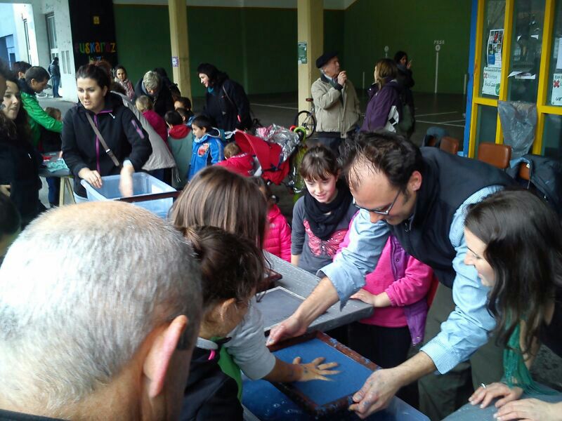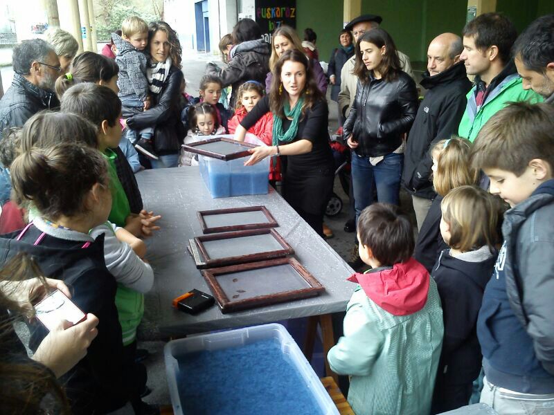 Herri bibliotekako lehioak paperez beteta egon dira egunotan. Bakoitza era batekoa, bakoitza berezia. Kolore desberdinekin, irudiez beteta edo txuri, zapatuan egin zituzten, eskuak uretan sartu eta masa egiten aritu ziren ume eta nagusiak plazabarripean. Oihal eta arropa zaharren zatitxoekin egin zuten papera, Margaret Mahan eta Drew Matott-en gidaritzapean. Hotza egin zuen baina «gustura» ibili ziren umeak. Eguaztenean batu zuten euren lana, herri bibliotekako lehioetan sikatu zen papera.