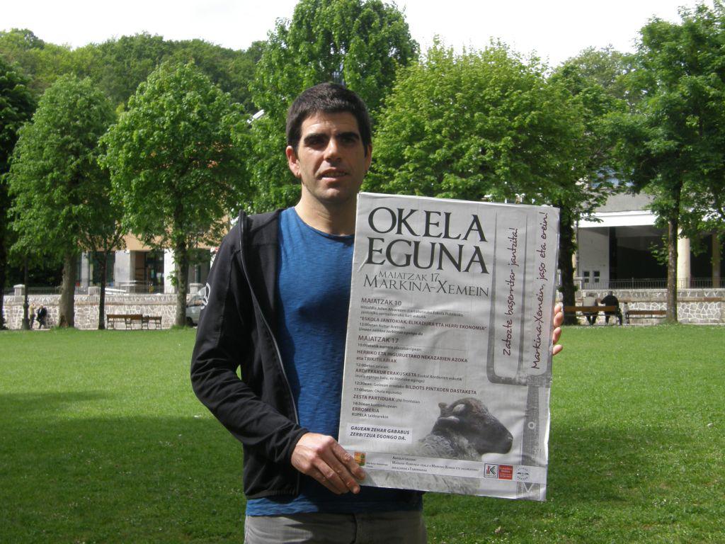 Alex Zenarruzabeitia Okela Eguneko antolatzaileetako bat kartela eskuan duela.