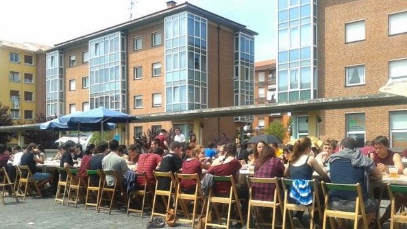 Bazkaria ere arrakastatsua izan zen eta 150 gazte elkartu ziren Plaza Baltzean prestatutako mahai luzean guztiak batera ospatzeko. Deiedra taldearen folk doinuek eta txapel jaurtiketak jarri zion giroa arratsaldeari.