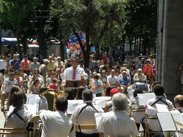 Markina-Xemeingo bandaren kontzertua entzuteko. Aurrekaldeko aulkiak bete egin dira kontzertuak aurrera egin ahala eta batzuk gerizpera ere eraman dituzte aulkiak eguzkitik ihesi. Herriko bandak errepertorio zabala jo du estilo guztietako doinuak eskainiz, bai euskal kantak zein pelikuletako doinuak ere.