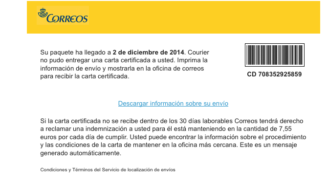 Internet erabiltzaileak mezuak modu masiboan ari dira jasotzen, batez ere gaur goizean [abenduak 4]; partikularrek eta erakunde eta enpresek ere jaso dituzte aipatu mezuak. Ertzaintzaren esanetan, “itxuraz, mezuak Correos enpresatik iristen dira (Espainiako posta-zerbitzuko eta paketeriako operadorea), eta hartzaileak jaso ezin izan duen pakete baten bidalketaren inguruko ohar faltsua egiten dute”.