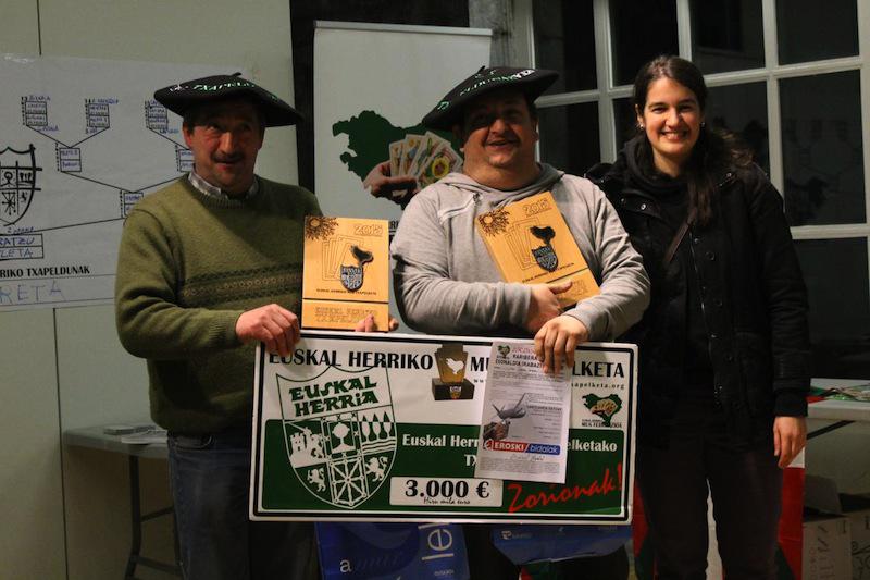 Joseba Goikoetxea eta Patxi Salazar txapelketako irabazleak Maitane Larrauri Lekeitioko alkateagaz. Argazkia: Euskal Herriko Mus Federazioa