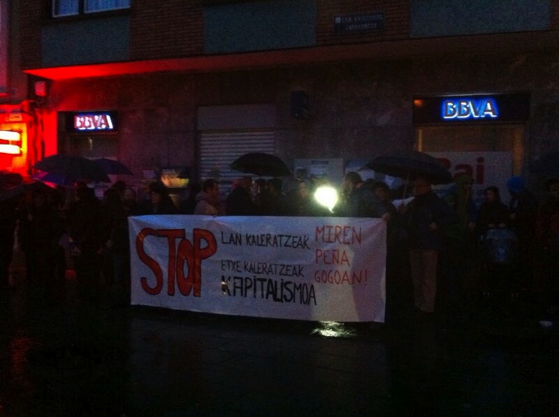Miren Peña gogoan, etxe kaleratzeen kontrako protesta egin zuten astelehen iluntzean Lekeitioko Eskolapean. Ondarroan eta Bermeon ere, margotuta agertu dira Laboral Kutxako hormak. Ez da izan buruhiltzea hilketa baino eta hiltzailea hitzak erabili dituzte Antsoaingo emakumearen heriotza salatzeko.