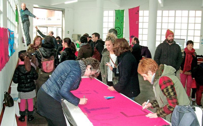 Erantzun ona izan zuen Lekeitioko Gure Esku lantaldeak antolatutako hitzorduak. Hiru orduz luzatu zen lana. 11:30ean hasi eta 14:30era arte egon ziren ume, gazte eta helduak, buru-belarri, oihalak margotu eta josten. «Jende ugari bildu zen eta mezu eta irudi ugari ikusi ziren», azaldu du Goio Urkiaga lantaldeko kideak.