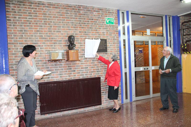 On Julian Olazabalagaren senideak eta Maite Garcia lankidea On Julianen oroigarriaren aurrean.