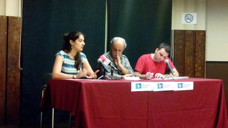 Benito Ansola beka aurkeztu dute Maitane Larrauri Lekeitioko Alkateak, Juan Kruz Igerabide EHUko Mikel Laboa Kadedraren zuzendariak eta Beñat Vidal Euskaltzaleen Topaguneko kideak. Argazkia: Euskaltzaleen Topagunea