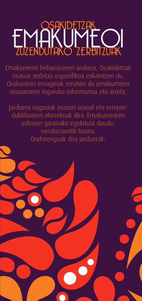 Orokorrean emaginak ematen du emakumeen osasunaren inguruko informazioa eta arreta, eta jarduera nagusiak osasun sexual eta erreproduktiboaren alorrekoak direla jakitera eman dute. Emakumearen edozein garairako egokituta daude, nerabezarotik hasita.