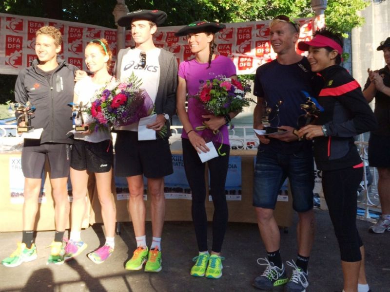 Lekeitioko triatloiko lehenengo emakume eta gizonezkoak sariak hartuta. Argazkia: Triatloi.org