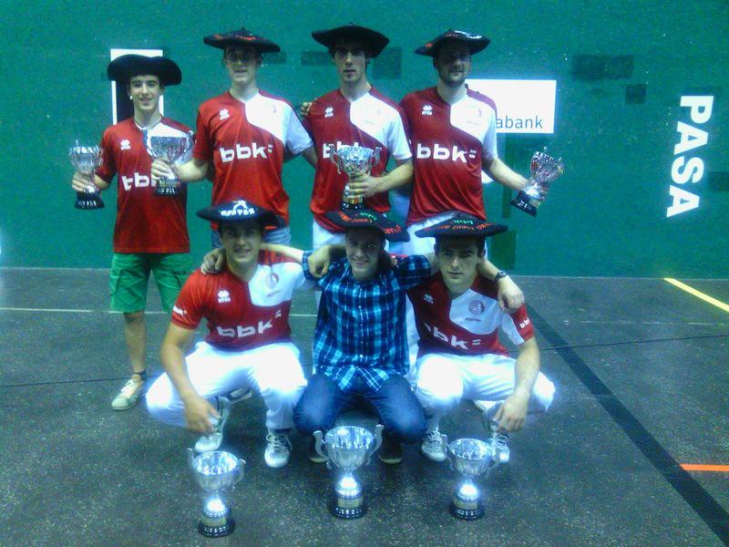 Markina-Xemeingo Esku Pilota Taldeko pilotariak eta entrenatzailea Herriarteko Txapelketako txapelak jantzita. Argazkia: Markina-Xemeingo Esku Pilota Taldea