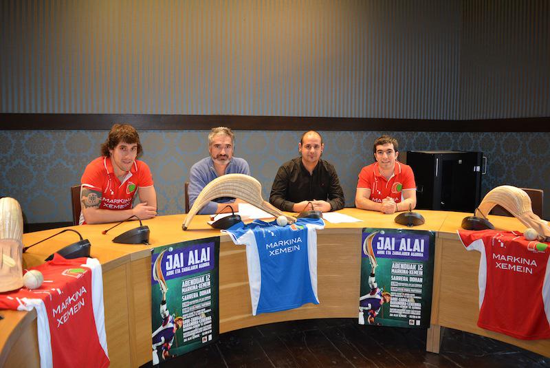 Abenduaren 12an egingo den jaialdiko aurkezpen ekitaldia. Argazkian: Jon Zabala pilotaria, Josu Mugartegi Atain Markina-Xemeingo Zesta-Punta Eskolako lehendakaria, Joseba Iraolagoitia kirol zinegotzia eta Jokin Arbe pilotaria.