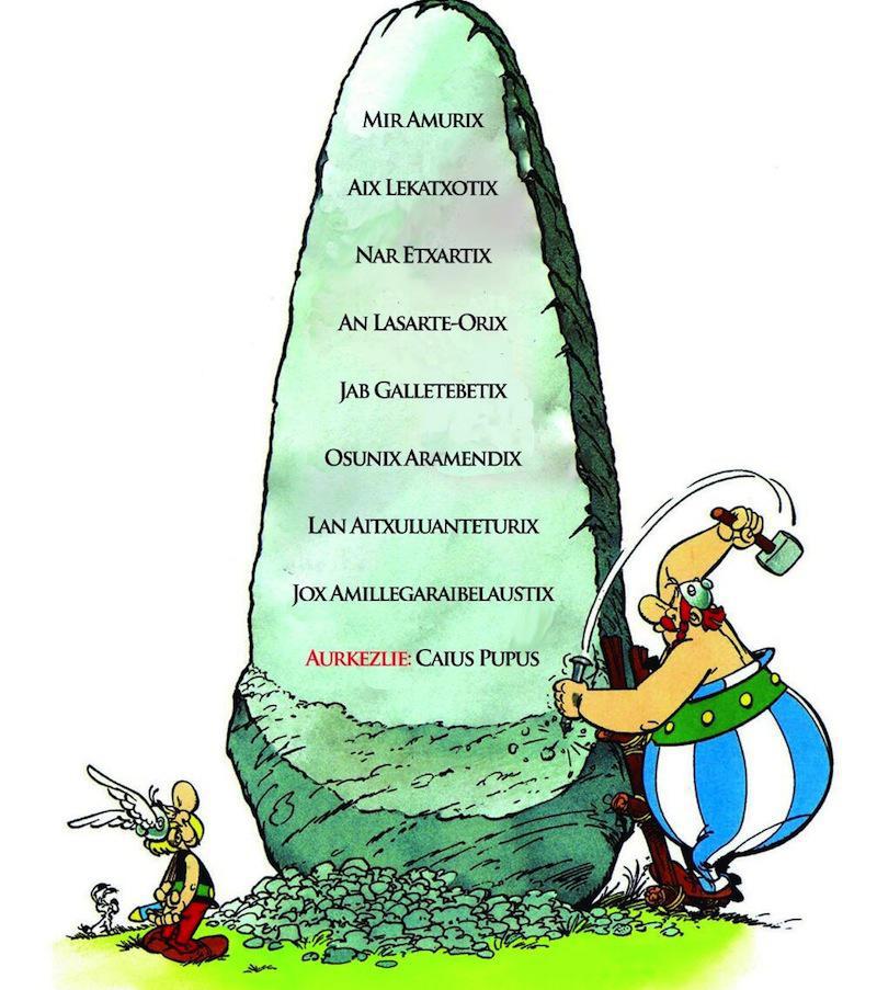 bertsoprobak. Asterixek eta Obelixek bezala, Miramurix, Aix Lekatxotix, Nar Etxartix, An Lasarte-Orix, Jab Galletebetix, Osunix Aramendix, Lan Aitxuluanteturix eta Jox Amillegaraibelaustix bertsolari galiarrek ere edabe majikoa beharko dute Caius Pupusek aginduko dizkien probak gainditzeko.