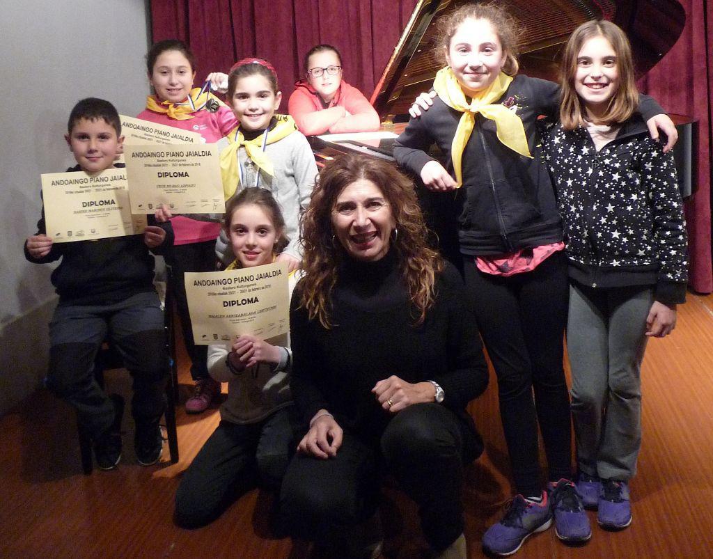 Ondarroako Unanue musika eskoltik jaialdira joandako ikasleak, Eli Andrinua irakasleagaz.