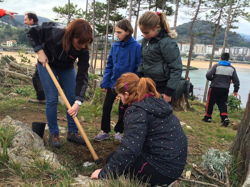 Lekeitioko ume eta nagusiak espezie ezberdinetako zuhaitzak landatu dituzte Garraitz irlan. Argazkia: Bizkaiko Foru Aldundia