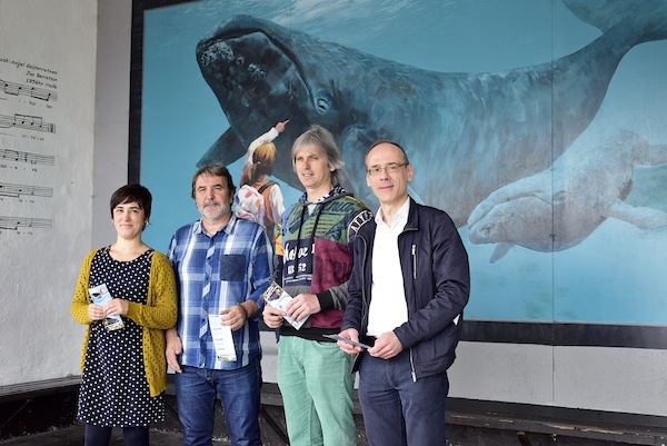 Geoparkeen Astearen aurkezpena, Mutrikun. Ezkerretik eskumara: Pedro Bengoetxea, Leire Barriuso, Jose Angel Lizardi eta Oier Korta.
