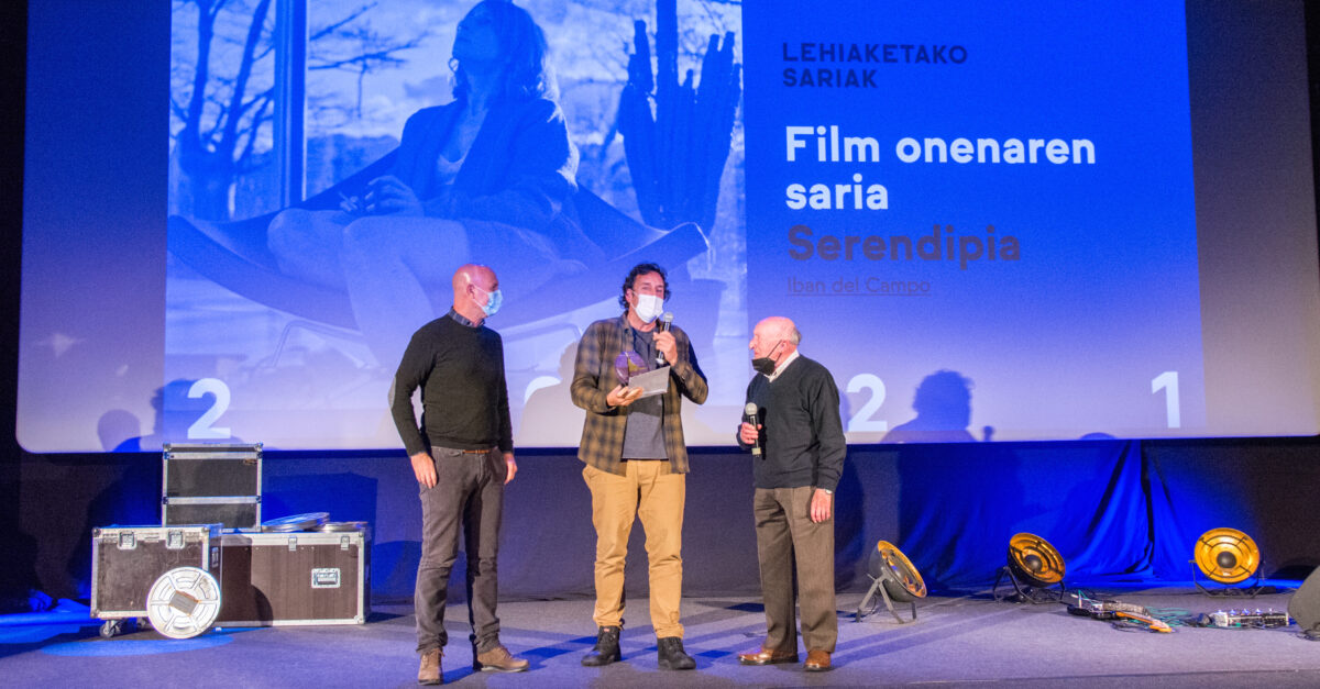 Euskal Zine Bileraren lehiaketako sari banaketa. Koldo Goitia Lekeitioko alkatea eta Benito Ansola Ivan del Campo Film onenaren irabazleari saria ematen. Argazkia: Euskal Zine Bilera Lekeitioko Euskal Zine Bilerak iragarri ditu aurtengo irabazleak. Gaur [azaroak 27] arratsaldean ospatutako sari banaketa ekitaldian eman dituzte ezagutzera. Film onenaren saria Iban del Camporen Serendipia filmarentzat izan da. zuzendaritza onenaren saria, berriz, Josu Martinezen Subandila lanari eman diote, eta gidoi onenaren saria Jorge Moneok jaso du Begiak Hesteko Artean filmarengatik. Saridunak erabakitzearen arduradunak Izaskun Arandia, Iratxe Fresneda eta Ane Pikaza zinegileak izan dira.