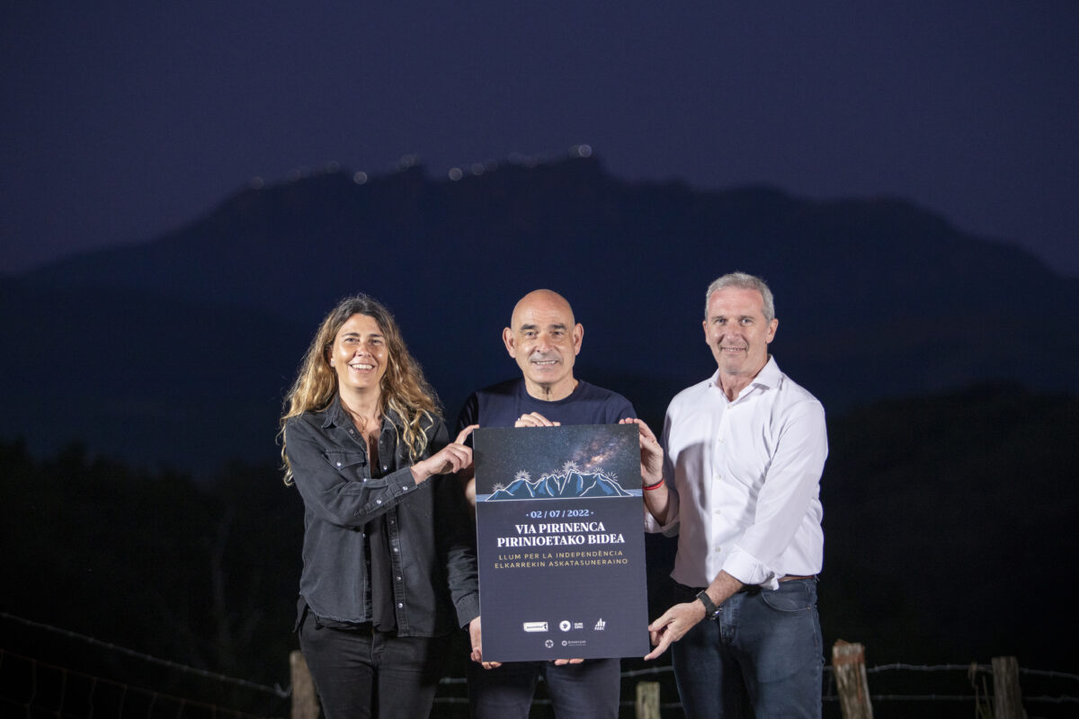 Antolatzaileak Pirinioetako Bideare ekimenaren kartela eskuetan. Iturria: Gure Esku Pirinioetako Bidea 2022 ekimena, Euskal Herriko eta Kataluniako entitate sozialek elkarlanean antolatutako lehen mobilizio herritarra da. Uztailaren 2an, Pirinio osoan zehar 300 gailurretik gora argiztatzea du helburu, argi lerro bat osatuz Higer lurmuturretik Creusera, Atlantikotik Mediterraneora.