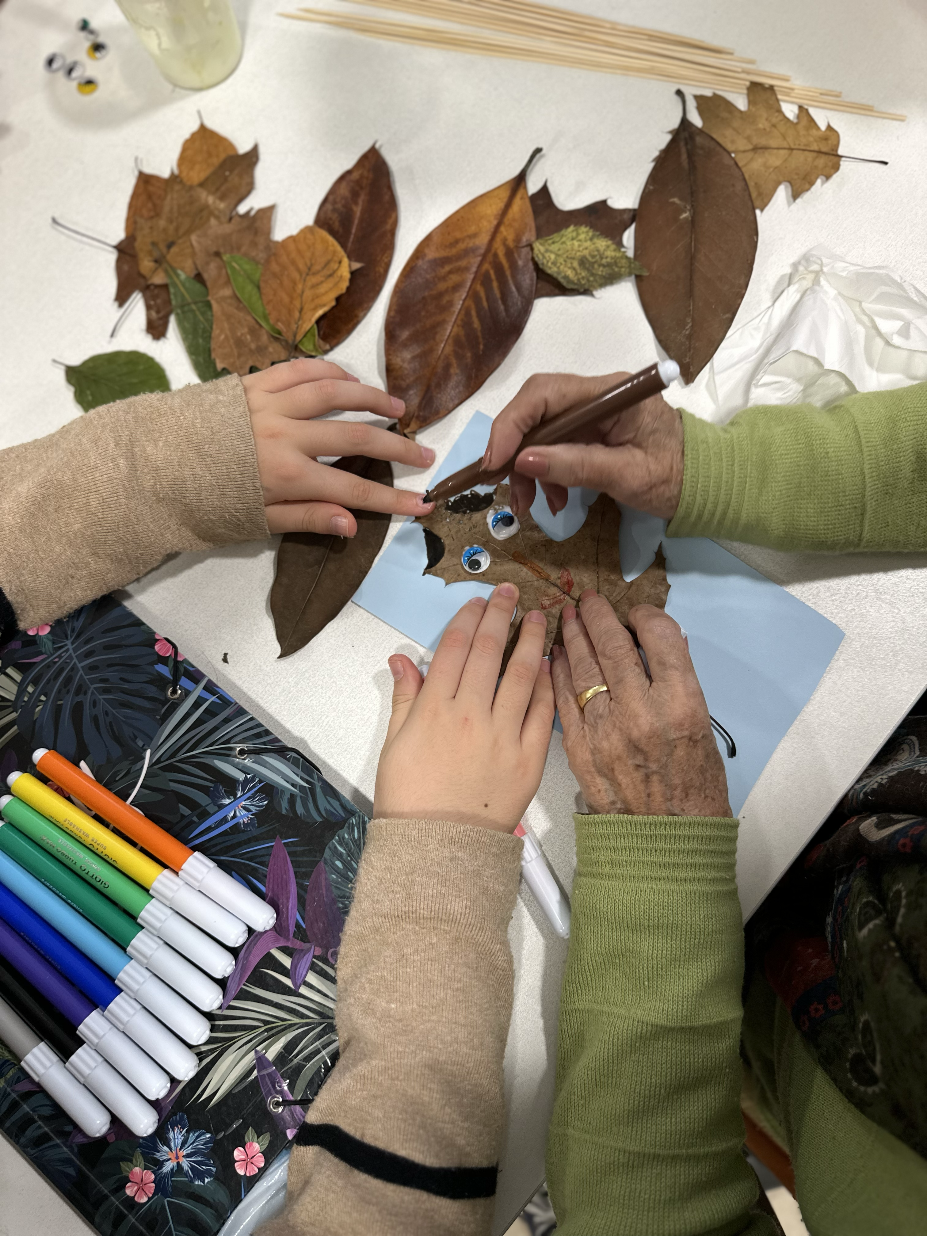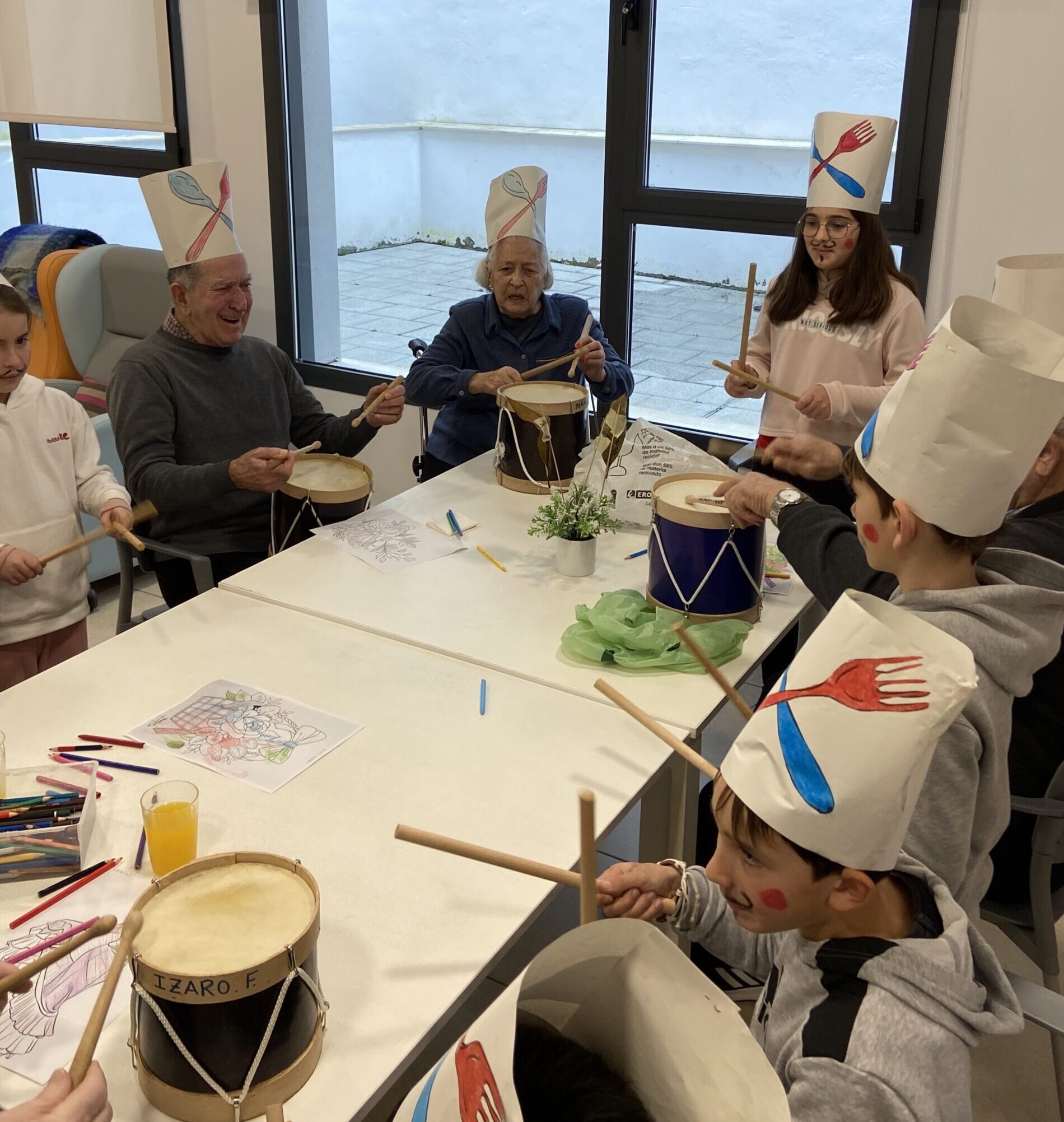 Lehenengo topaketan ikasleek jasotako hostoak eraman zituzten Eguneko Zentrora, eta lehen harremanak sortzeko bide bilakatu ziren hostoak. Elkarren ondoan jarri eta ikasleen laguntzarekin koloreztatu eta apaingarriak jarri zizkieten egoiliarrek. Ostean, danborradarako xehetasunak prestatzen ibili ziren: txapelak neurrira egin, margotu, makilak eskuan hartu eta danborrak astindu zituzten, doinuari jarraituz.