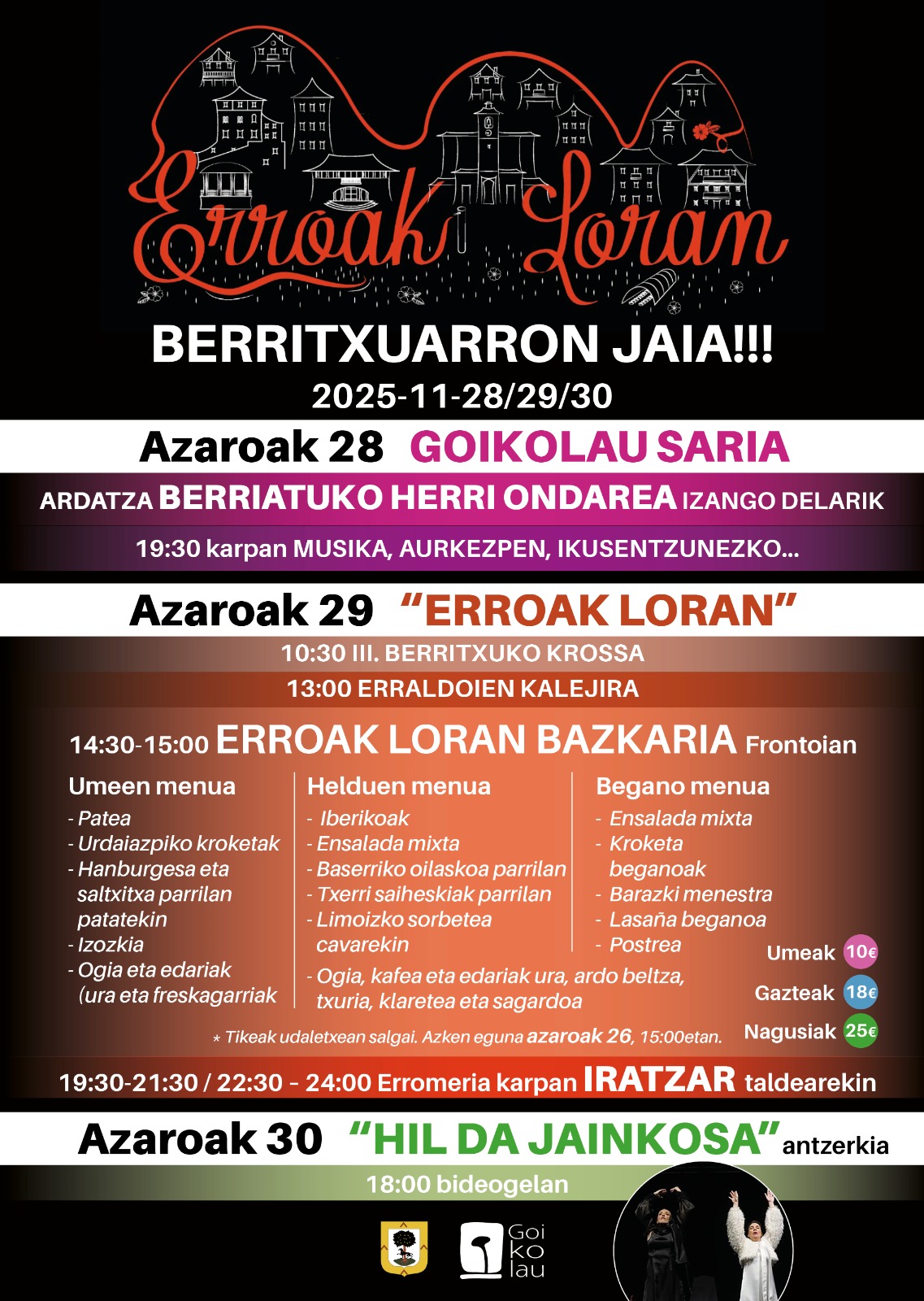 Hau da, krosa Erroak Loran jaialdiko egun luzeari aurre egiteko modurik onena izan daiteke: jan-edan bete-betean sartzeko aitzakia. 13:00etan Lami eta Maru erraldoiek kaleak hartuko dituzte beste behin eta jaiak eztanda egingo du. Mendibarren frontoian 350 lagun inguru elkartuko dira bazkaltzeko. Gaur [azaroak 26] izan da udaletxean tiketak erosteko azken eguna. Iratzar erromeriagaz luzatuko dute eguna eta gaua berriatuarrek nahi dutenera arte: 19:30etik 21:30era egingo dute kontzertuko lehen zatia eta 22:30etik 24:00etara bigarrena. Domekan [azaroak 30], 18:00etan, Nerea Gartzia eta Ainhoa Etxebarria ondarrutarrek Hil da jainkosa antzezlana eskainiko dute bideogelan Erroak Loran jaialdiari amaiera emateko.