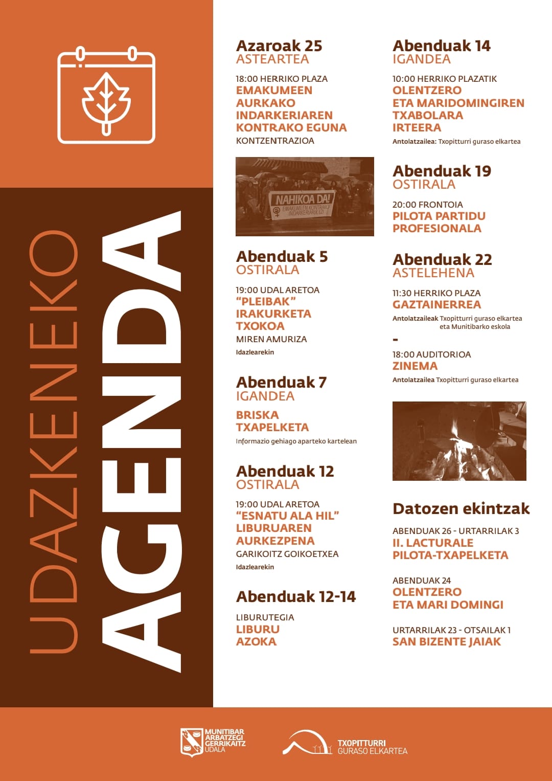 Orain dela urte batzuk hasi ziren agenda bateratuak ateratzen: udazkenean, neguan eta udaberrian. Herriko eragile edo elkarte desberdinek antolatzen dituzten ekintzak bateratzeko asmoagaz. “Herritarrek herrian dauden ekintza guztiak modu ordenatu eta argi batetan izan ditzaten. Gainera gure arteko elkarlana bultzatzeko eta indartzeko modu egokia dela iruditzen zaigu, komunikazioa hobetuz”, esan dute.