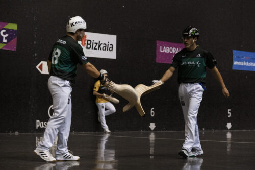 Argazkia: Eraman Jai Alai. Alex Goitia markina-xemeindarrak eta Unai Lekerika gernika-lumotarrak Eusko Label Winter Series txapelketa poltsikoratzeko balentriak egiten jarraitzen dute. Jai Alaiko errezeta pil-pilean dago, finalaurrekoen ligaxkan bete-betean sartuta, eta bikote horrek azkenburukoraino iristea du jomuga. Atzo [urtarrilak 5], zesta-puntaren katedralaren harmailak beste behin lepo bete zituzten ikusleen aurrean, hiru barik, bi izan ziren magia egin zuten erregeak.