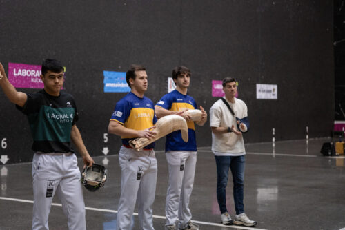 Argazkia: Eraman Jai Alai. Eusko Label Winter Seriesen txapelak Lapurdira jo du estreinakoz. Xabier Barandika gernika-lumotarraren hutsunea ederto bete zuen Johan Sorozabal miarriztarrak, eta gainditu ezinezko ekuazioa osatu zuten hark eta txapelketa gogoangarria egin duen Thibault Basque bidartarrak. 2 eta 1 menperatu zituzten Alex Goitia markina-xemeindarrak eta Unai Lekerika gernika-lumotarrak osatutako bikotea.