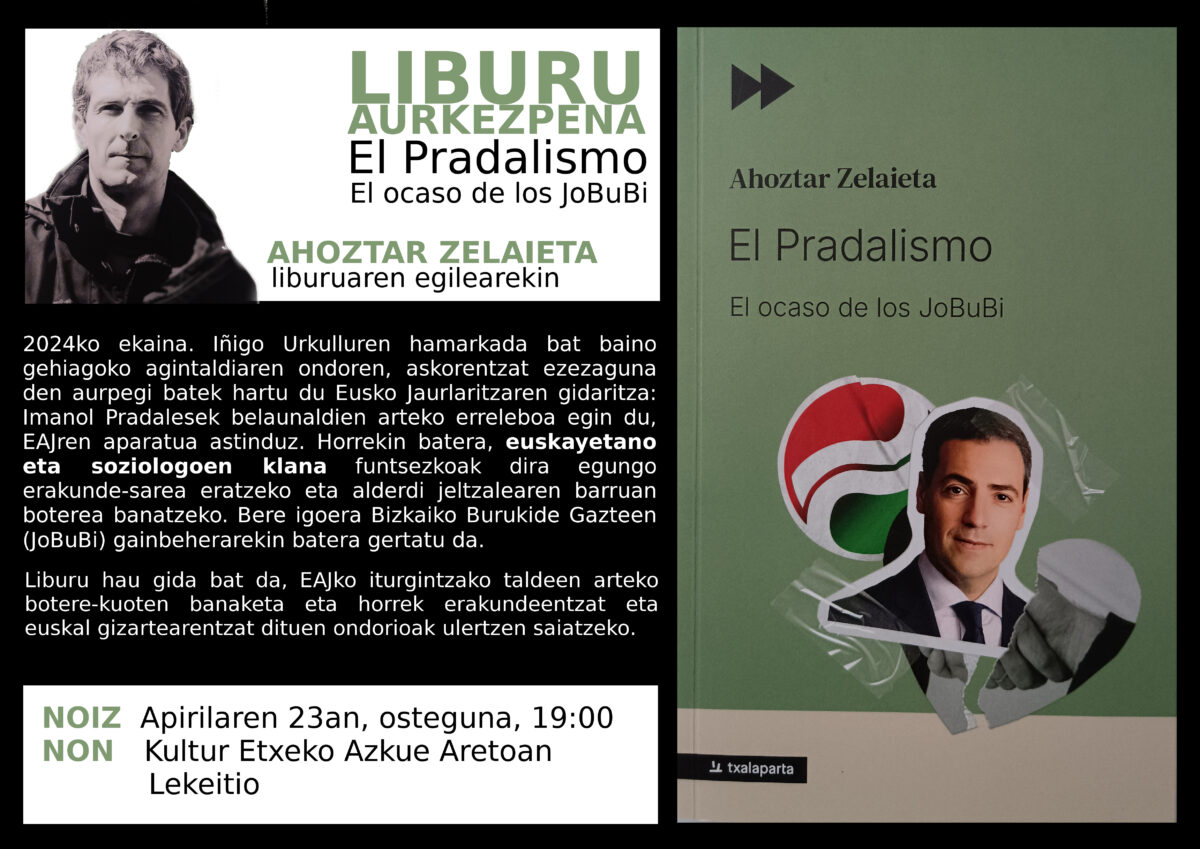 Ahoztar Zelaieta kazetari eta idazleak El Pradalismo El ocaso de los JoBuBi liburua aurkeztuko du Lekeition datorren eguenean [apitilak 23], 19:00etan. Ekitaldia Kultur Etxeko Azkue aretoan izango da, eta bertan egileak berak azalduko ditu bere lanaren gako nagusiak.