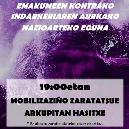 Indarkeria Matxistaren Aurkako Nazioarteko Eguna dela eta, 19:00etan mobilizazio zaratatsua egingo dute, arkupetik hasita. “Ez ahaztu zarata ateratzeko zerbait ekartzeaz”.