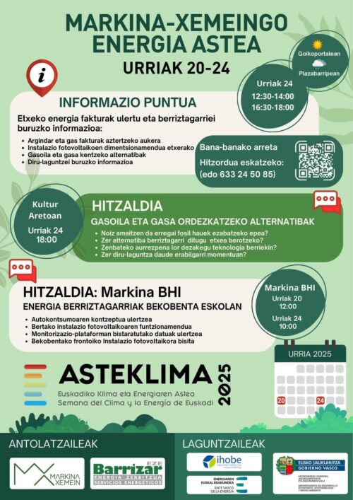 - 12:30-14:00 eta 16:30-18:00. Etxeko energia fakturak ulertu eta berriztagarriei buruzko informazioa jasotzeko informazio puntua. Eguraldi onarekin, Goikoportalean; eguraldi txarrarekin, Plazabarripean. Banan-banako arreta edukiko du, eta hitzordua eskatzeko 633 24 50 85 telefonora deitu behar da.