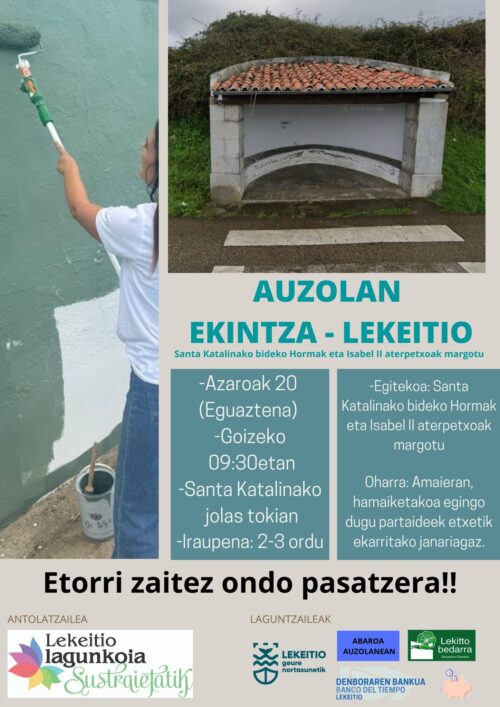 Auzolan ekintza egingo du Lekeitio Lagunkoiak azaroaren 20an, 09:30ean, Santa Katalinako jolastokian. 3 ordu inguruko auzolana izango da, eta Santa Katalinako bideko hormak eta Isabel II aterpetxoak margotuko dituzte. Amaieran hamaiketakoa egingo dute partaideek eroandako janariagaz.