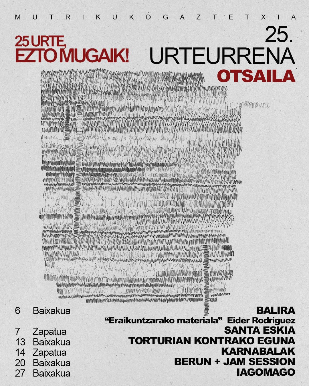 Mutrikuko gaztetxeare 25. urteurrenaren harira otsailareko egitaraua argitaratu dute gazte asanbladako kideek. Egitarauaren baitan, Balira irakurle taldea Eider Rodriguezen Eraikuntzarako materiala liburua lantzeko batuko da otsailaren 6an [barikua], 19:00etan, gaztetxean.