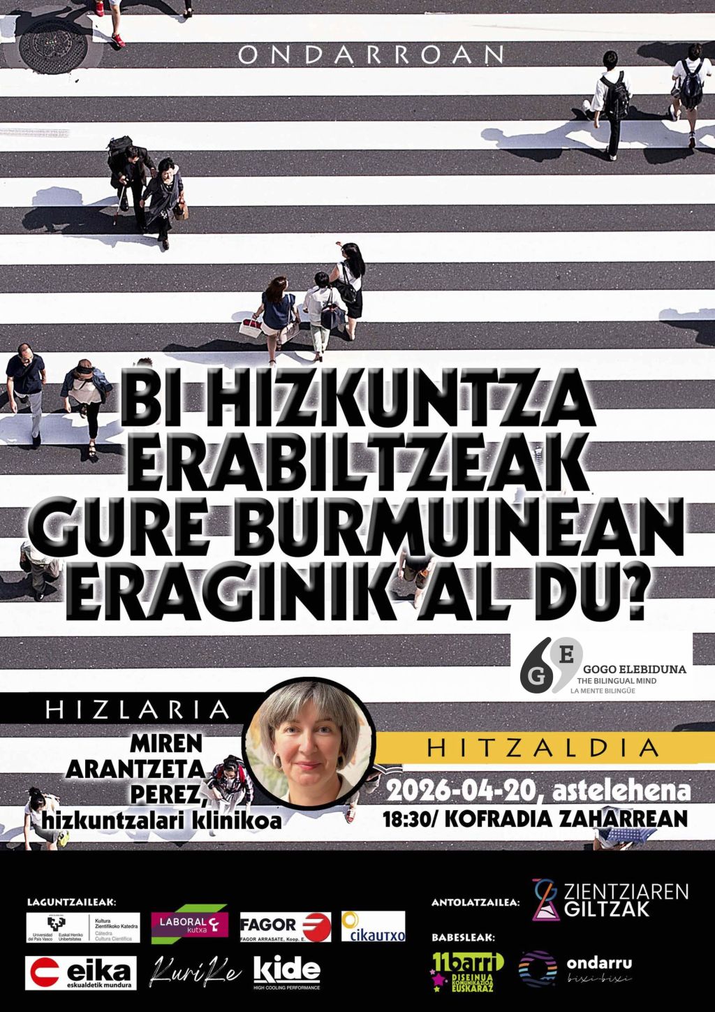 Bi hizkuntza erabiltzeak gure burmuinean eraginik al du? hitzaldia egongo da apirilaren 20an Ondarroako Kofradia Zaharrean, 18:30ean. Zientziaren Giltzak antolatutako hitzaldian Miren Arantzeta Perez hizkuntzalari klinikoak hitz egingo du.