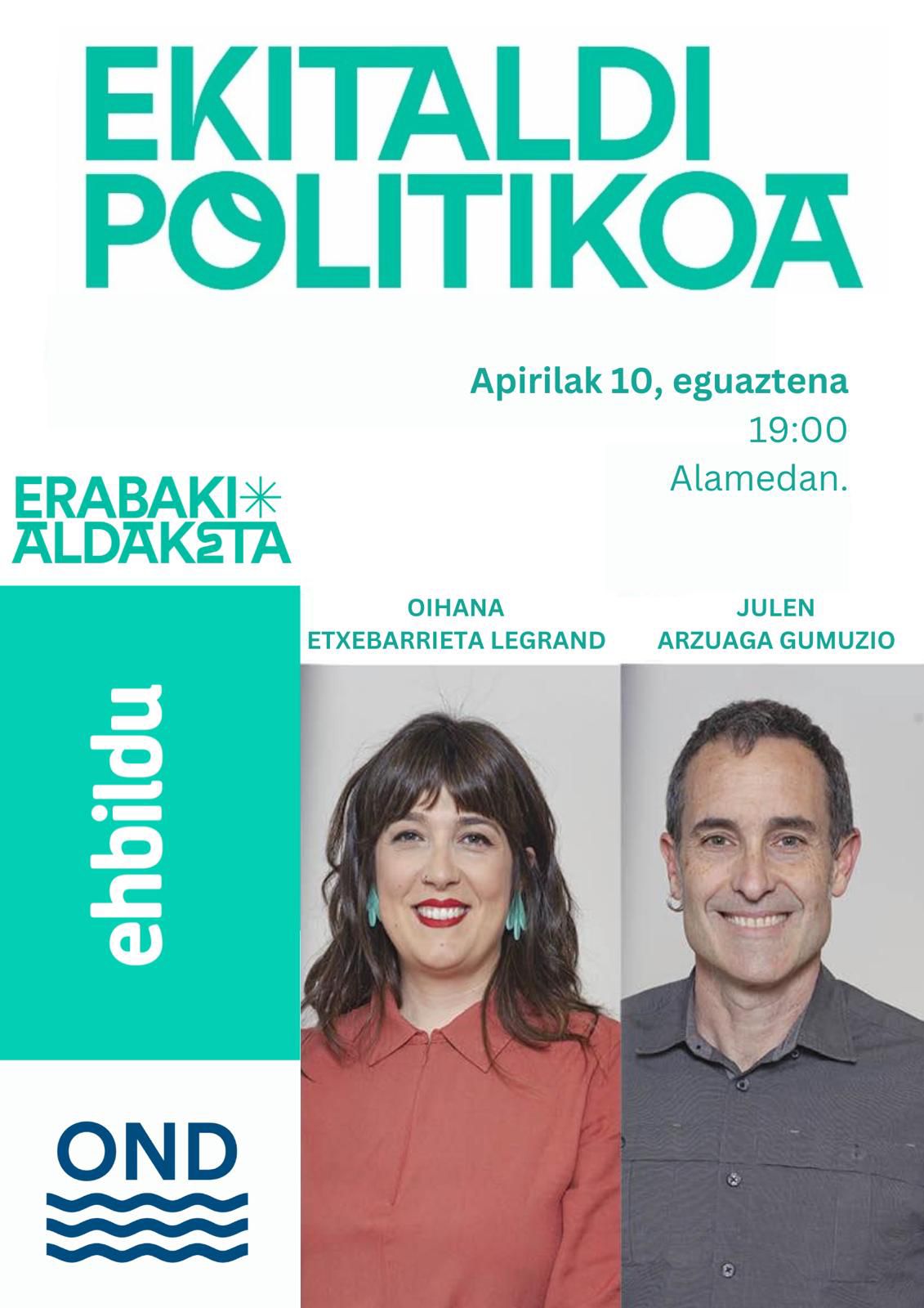 Eh Bilduren ekitaldi politikoa apirilaren 10ean, 19:00etan, Alamedan. Oihana Etxebarrieta Legrand eta Julen Arzuaga Gumuzio egongo dira.