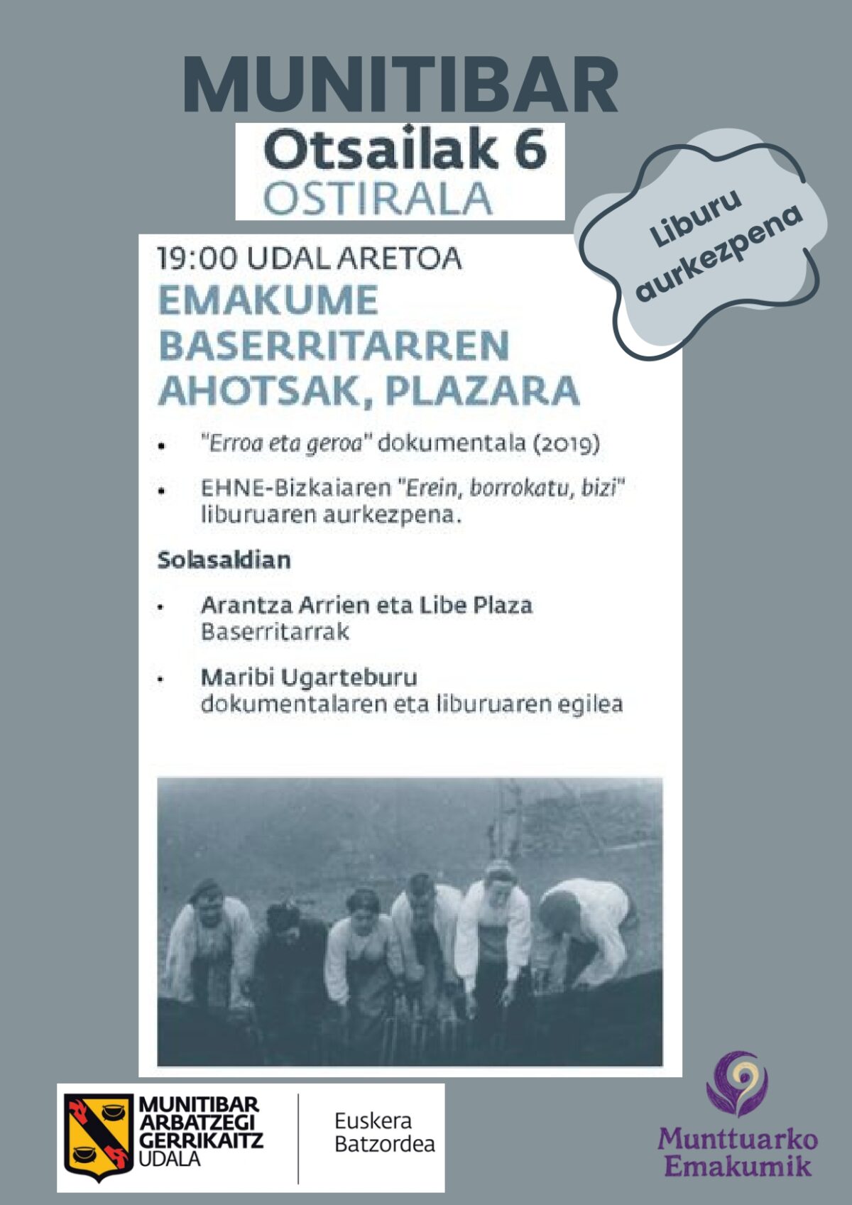 Munitibar. Munitibarko Euskara Batzordeak eta Munitibarko Emakumeek Maribi Ugartebururen Erein, Borrokatu, Bizi liburuaren eta Erroa eta geroa dokumentalaren aurkezpena prestatu dute, Emakume baserritarren ahotsak, plazara ekimenean.