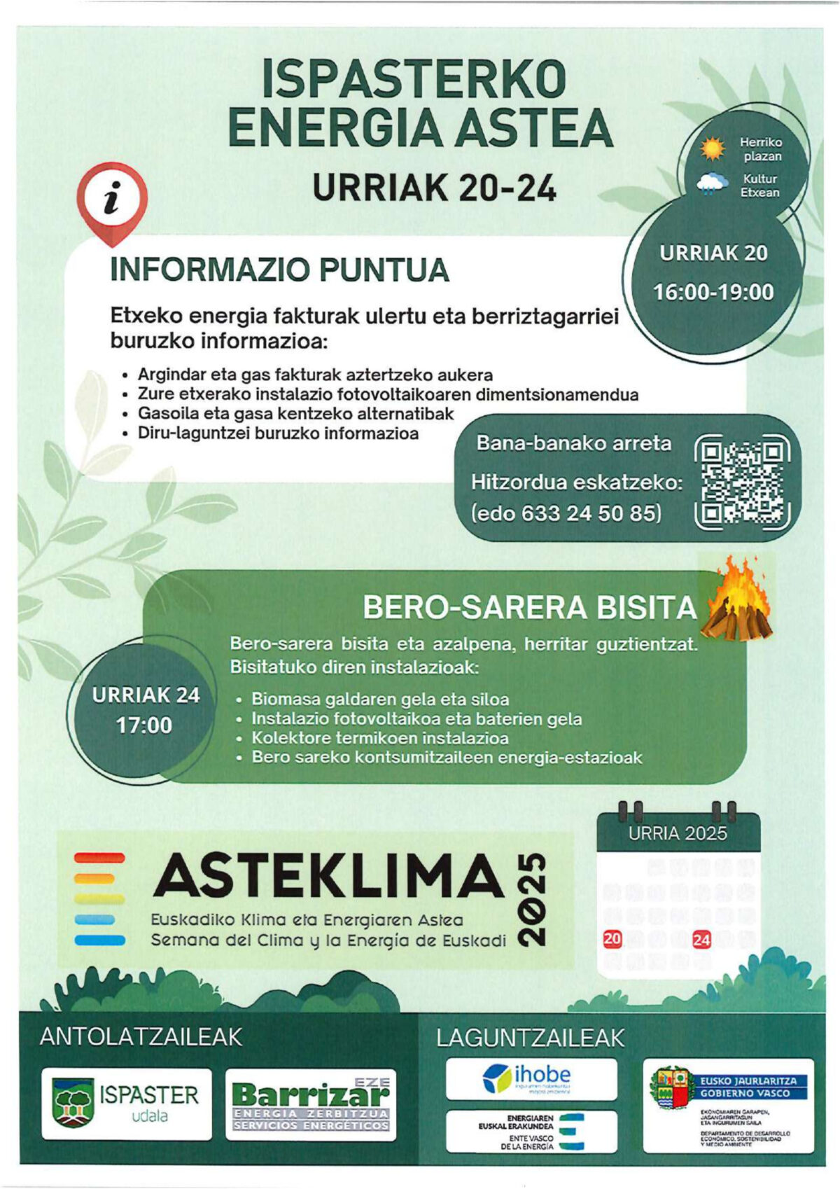 Ispasterko Energia Astearen baitan, etxeko energia fakturak ulertu eta berriztagarriei buruzko informazio puntua, urriaren 20an [astelehena], 16:00etatik 19:00etara, herriko plazan.