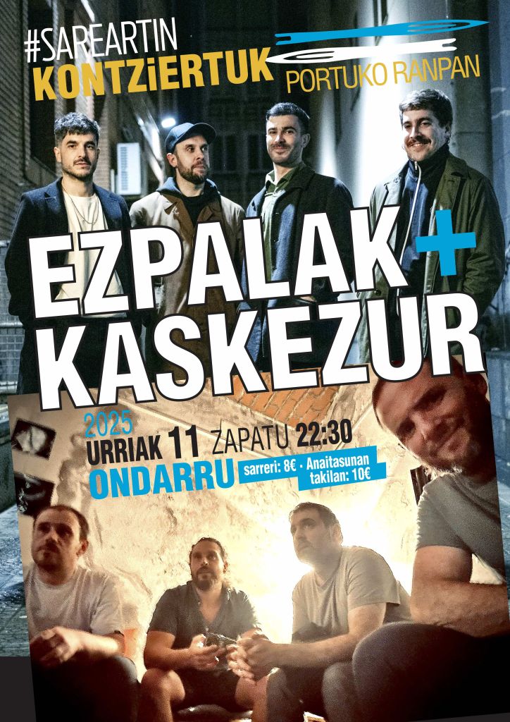 #Sareartin kontzertu zikloaren barruan, Ezpalak eta Kaskezur taldeen kontzertuak egongo dira Ondarroako Portuko Ranpan zapatuan [urriak 11], 22:30ean. Sarrerak Anaitasunan daude salgai zortzi eurotan, eta egunean bertan 10 eurotan egongo dira takilan.