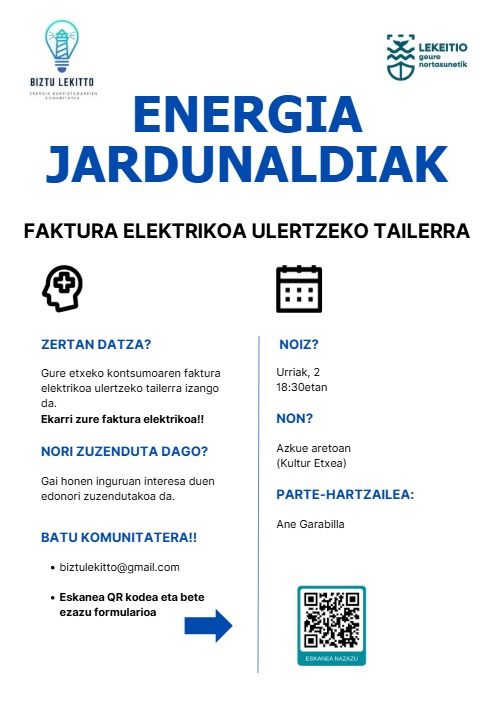Biztu.Lekitto Energia Berriztagarrien Komunitateak antolatuta, Faktura eletrikoa ulertzeko tailerra, urriaren 2an [eguena], 18:30ean, Azkue Aretoan.