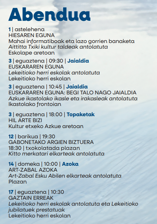 Lekeitioko herri eskolak antolatuta eta jubilatuek prestatuta, gaztain erreak, abenduaren 17an [eguaztena], 10:30ean, Lekeitioko herri eskolan.