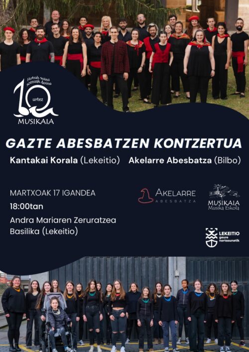 Lekeitioko Musikaia Musika Eskolak gazte abesbatzen kontzertua antolatu du. Lekeitioko Kantakai Koralaz gain, Bilboko Akelarre Abesbatza ere bertan egongo da. Martxoaren 17an, 18:00etan jarri dute hitzordua, Andra Mariaren Zeruratzea Basilikan.