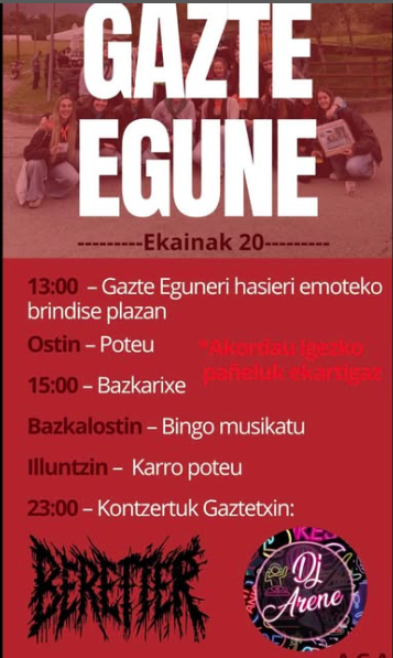 Gazte Egunagaz emando diote hasiera Aulestiko San Joan jaiei ekainaren 20an [barikua], egun guztiko egitarauagaz, Aulestio Gazte Asanbladak antolatuta. 13:00etan Gazte Egunari hasiera emateko brindisa egingo dute, eta 15:00etan bazkarian batuko dira. Ondoren, Bingo musikatuagaz giotuko dute eguna, eta karropoteoaren ostean, 23:00etan, Beretter taldearen kontzertua egongo da. gero, Dj Arene igoko da oholtzara.