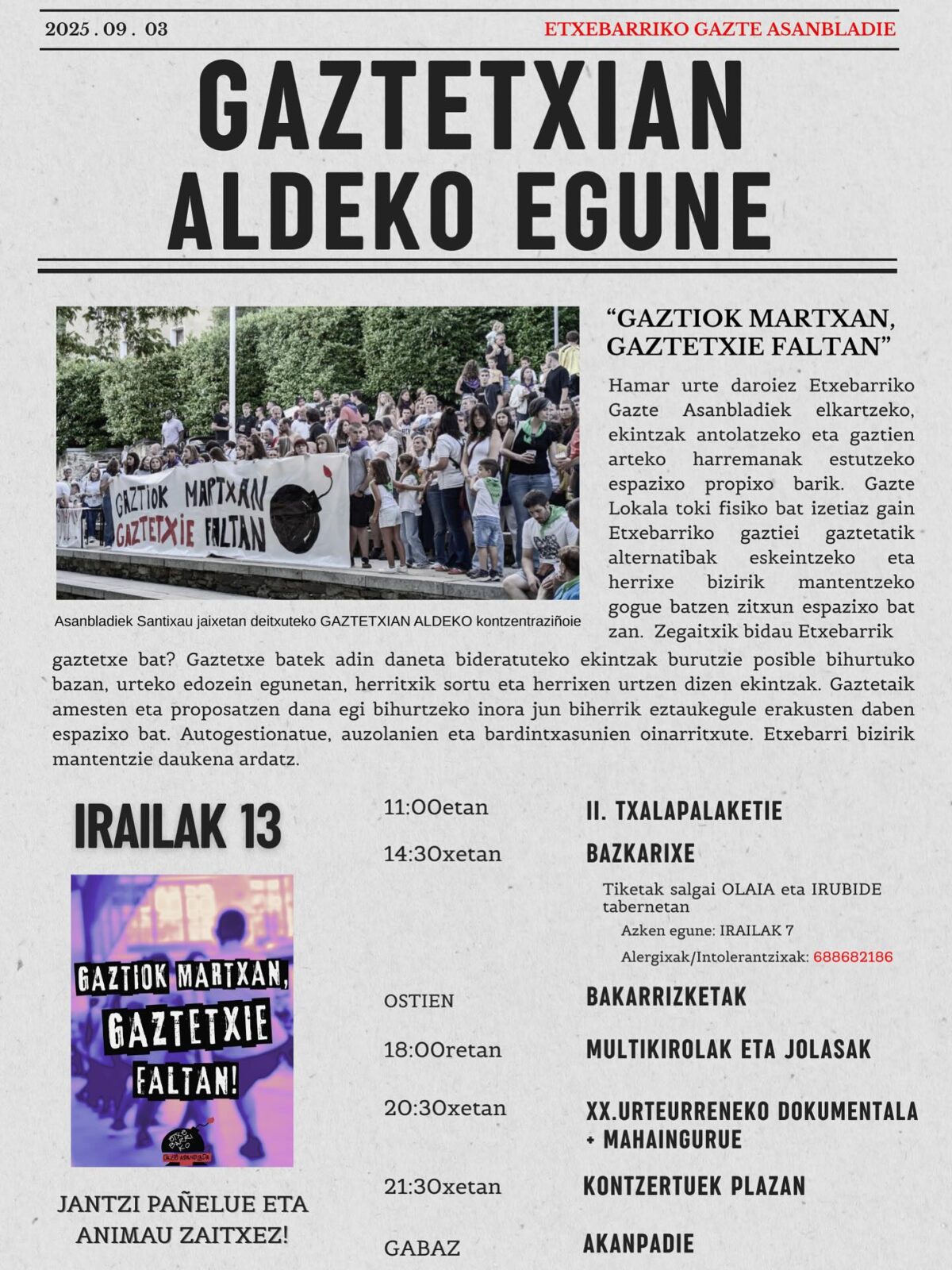 Gaztetxian aldeko egune, irailaren 13an [zapatua], 11:00etatik aurrera, Etxebarrian.