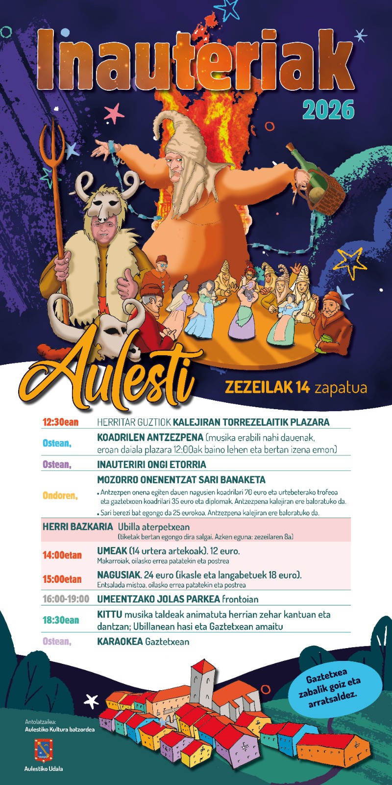 Otsailaren 14an [zapatua] ospatuko dituzte inauteriak aulestiarrek. 12:30ean emango diote hasiera egitarauari Torrezelatik plazara arteko kalejiran, eta ostean, kuadrilen antzezpena egongo da. Ondoren, mozorro onenaren sariak banatuko dituzte, eta gero, herri bazkarian batuko dira. Bazkalostean, umeentzako jolas parkea egongo da frontoian, eta 18:30ean Kittu musika taldeak kontzertua eskainiko du. Ostean, karaokea egongo da gaztetxean.