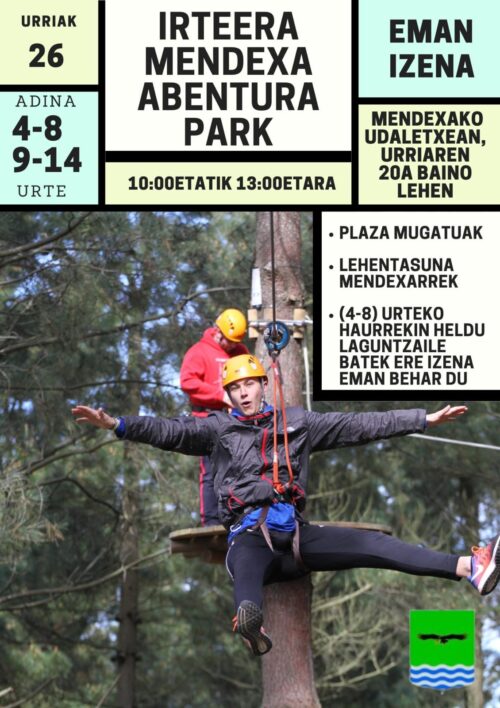Mendexako Udalak irteera antolatu du Mendexa Abentura Parkera. Urriaren 26an, 10:00etatik 13:00etara egingo dute irteera. 4-8 eta 9-14 urte bitartekoentzako irteera da.