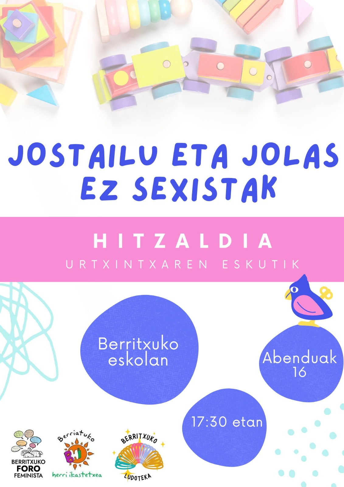 ‘Jostailu eta jolas ez sexistak’ hitzaldia, Urtxintxaren eskutik, abenduaren 16an [martitzena], 17:30ean, Berriatuko eskolan.