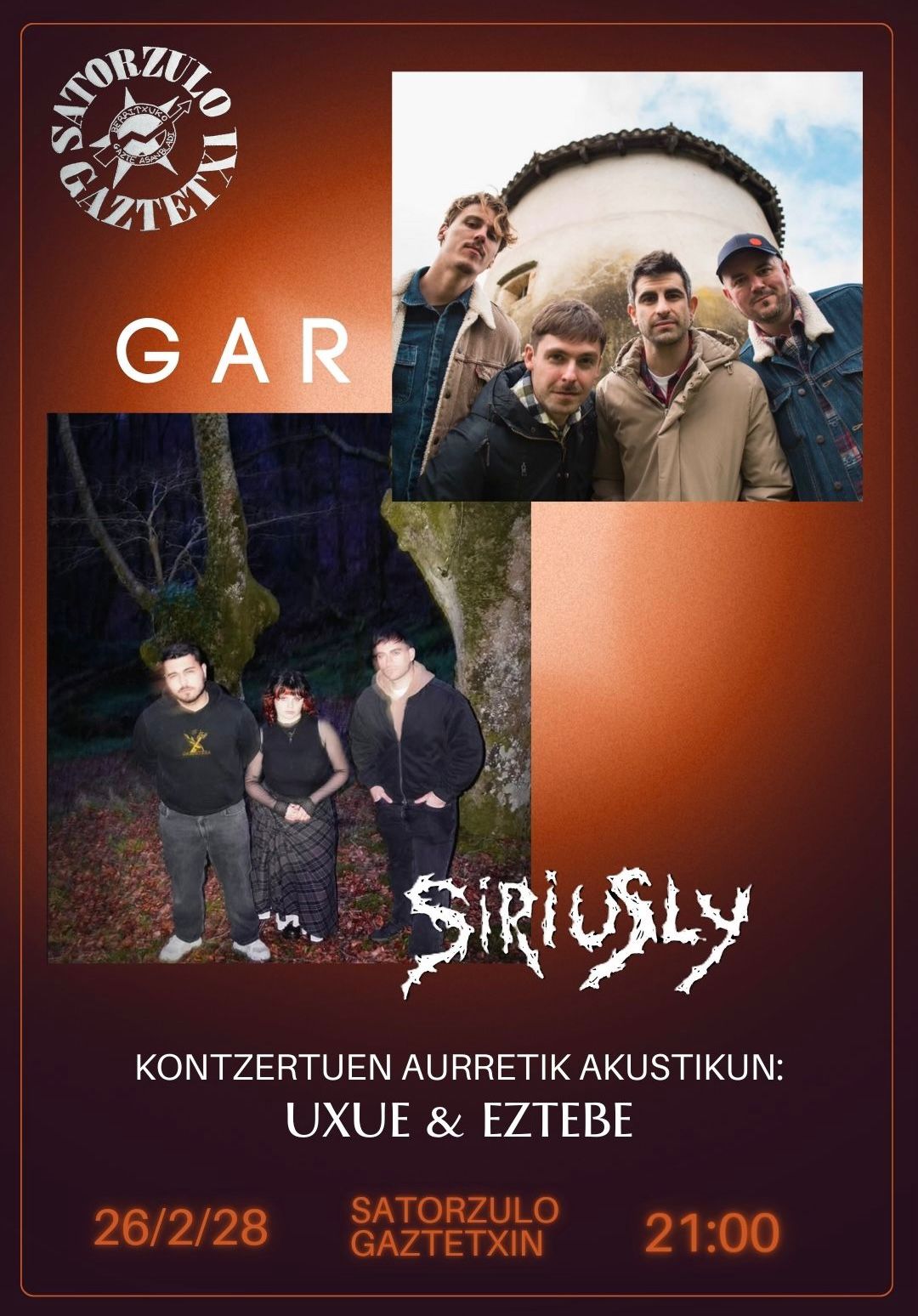 Berriatua. Zapatuan [otsailak 28] kontzertuak egongo dira Berriatuako Gaztetxean. 21:00tan Uxuek eta Eztebek kontzertu akustikoarekin hasiko dute gaba. Ondoren, GAR talde durangarrak joko du, 2025an Gazte Maketa Lehiaketa irabazi zuten eta aurten, “Oraina eskuetan” diska aurkeztuko dute. Amaitzeko, Siriusly taldeak eszenatokia hartu eta gaba amaituko du haien “Black Hole” lanarekin, rock alternatibo estiloko musikarekin.