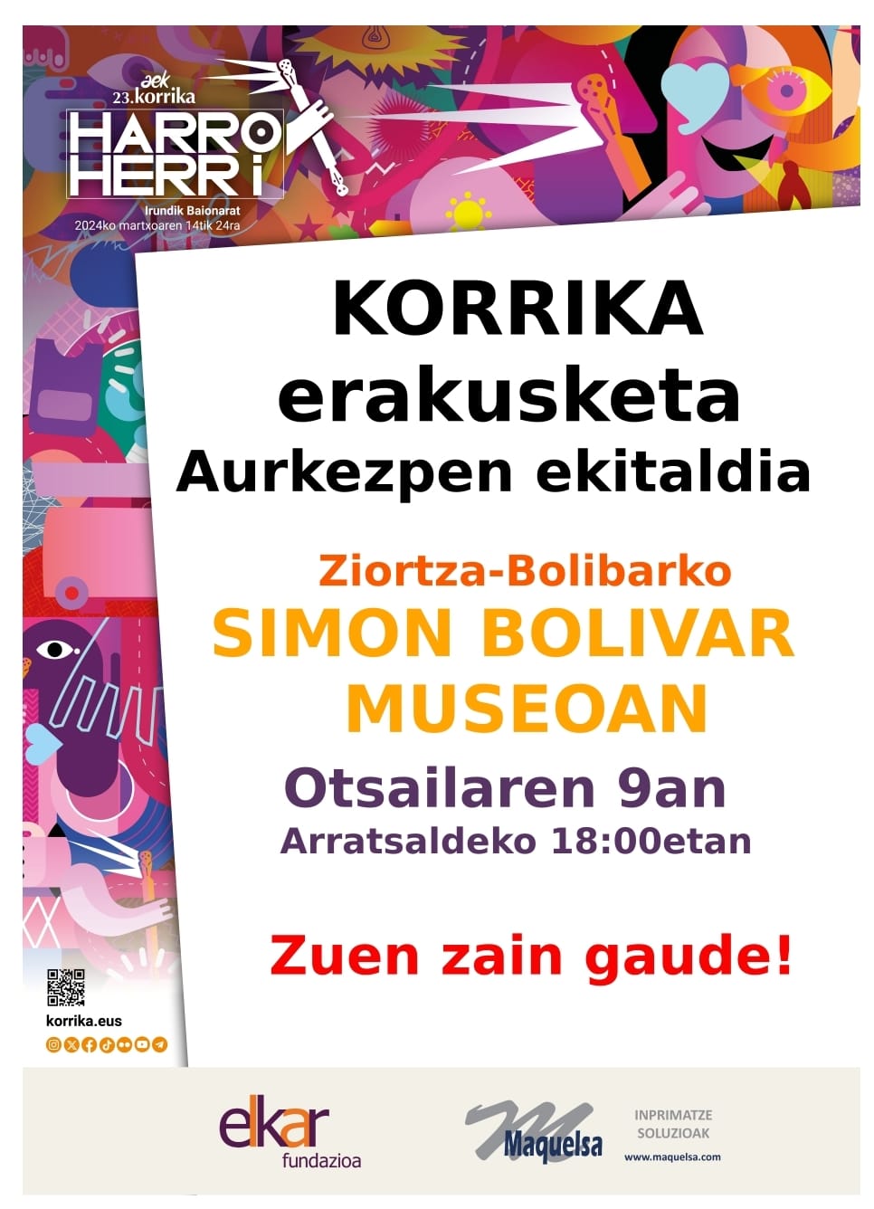Ziortza-Bolibarko Simon Bolivar Museoan korrikako erakusketa egongo da otsailaren 9tik apirilaren 7ra. Aurkezpena otsailaren 9an egingo dute, 18:00etan.