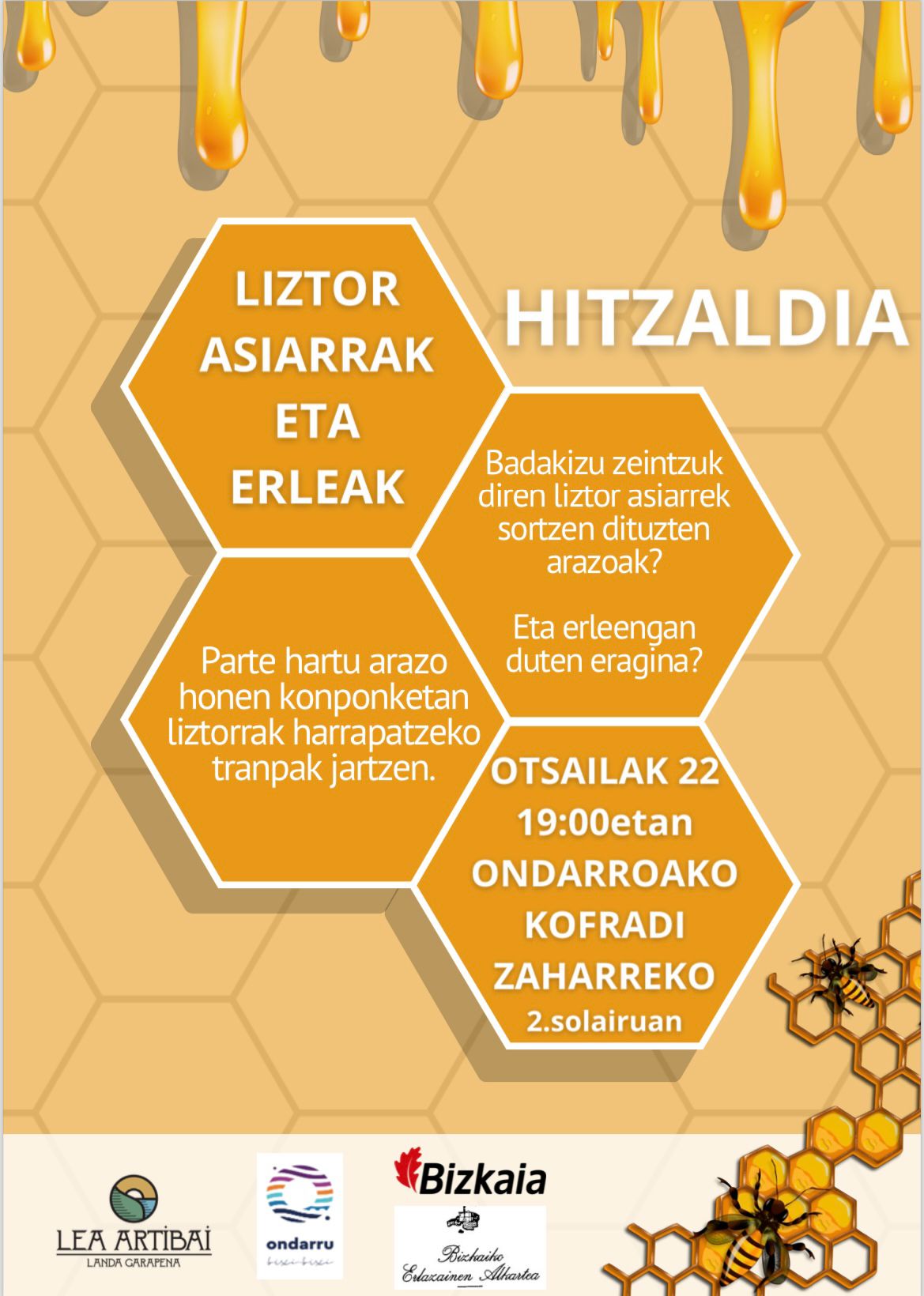 Liztor asiarrei eta erleei buruzko hitzaldia emango du Joxean Ostolaza eztigilean otsailaren 22an 19:00etan Kofradia Zaharreako bigarren solairuan. “Parte hartu honen konponketan liztorrak harrapatzeko tranpak jartzen”.