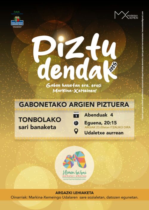 Hemen Be Bai elkarteak antolatuta, Piztu Dendak ekitaldia egingo dute abenduaren 4an, 20:15ean, Markina-Xemeingo udaletxe aurrean. Tonbolako sariak banatuko dituzte eta Gabonetako argiak piztuko dituzte.