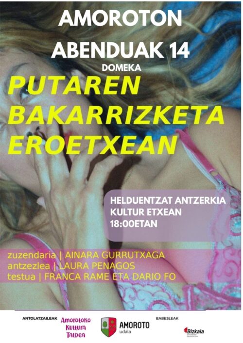Amorotoko Kultura Taldeak eta Amorotoko Udalak antolatuta, Putaren bakarrizketa eroetxean antzezlana egongo da abenduaren 14an, 18:00etan, Amorotoko kultur etxean. Helduentzako antzerkia da.