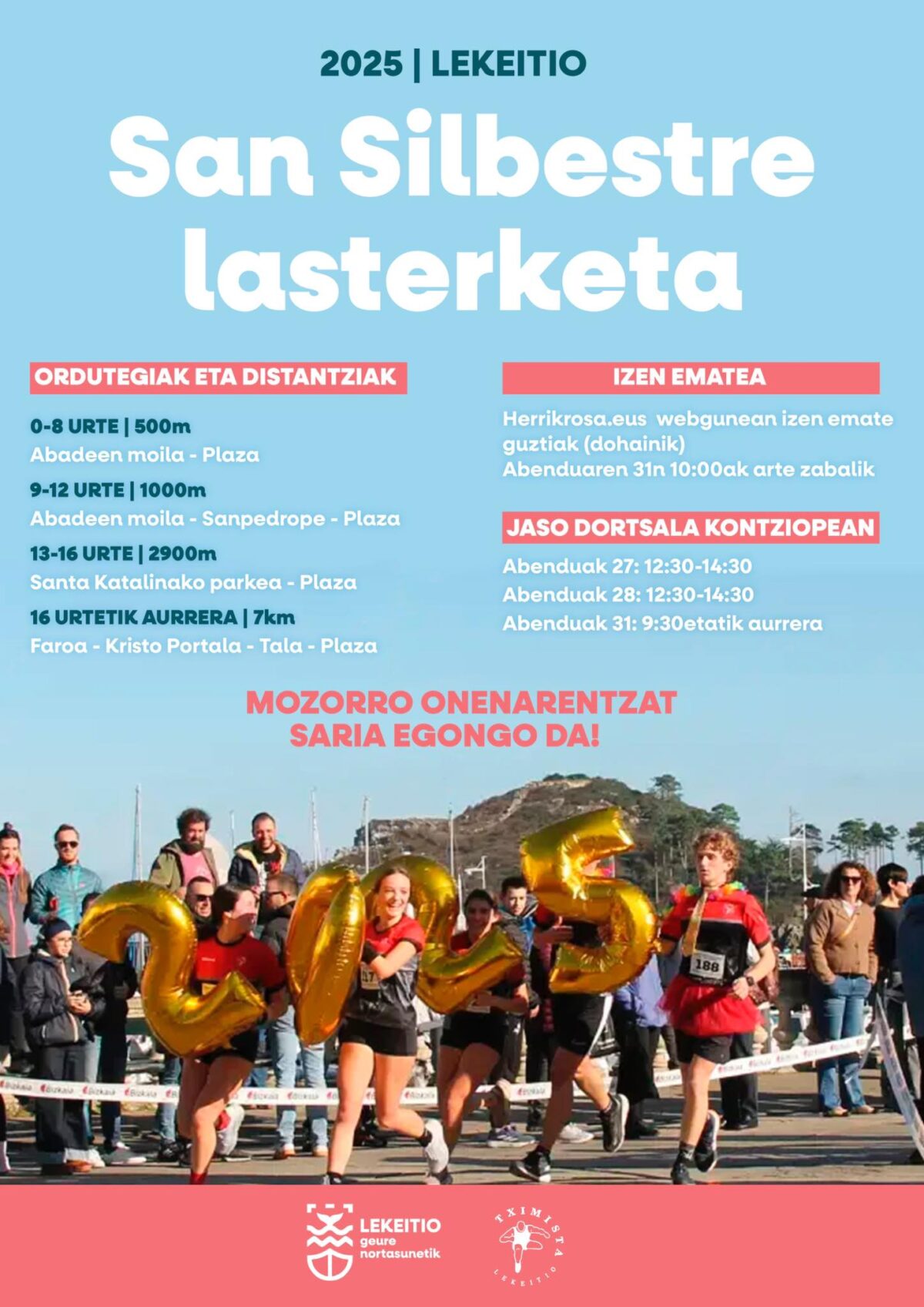 Lekeitioko Udalak eta Tximista atletismo taldeak antolatuta, San Silbestre laskerketa, abenduaren 31n [eguaztena], 11:00etatik aurrera.